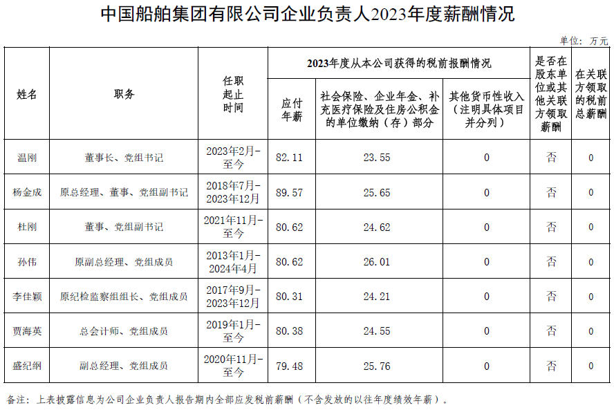 中國船舶集團有限公司企業負責人2023年度薪酬情況